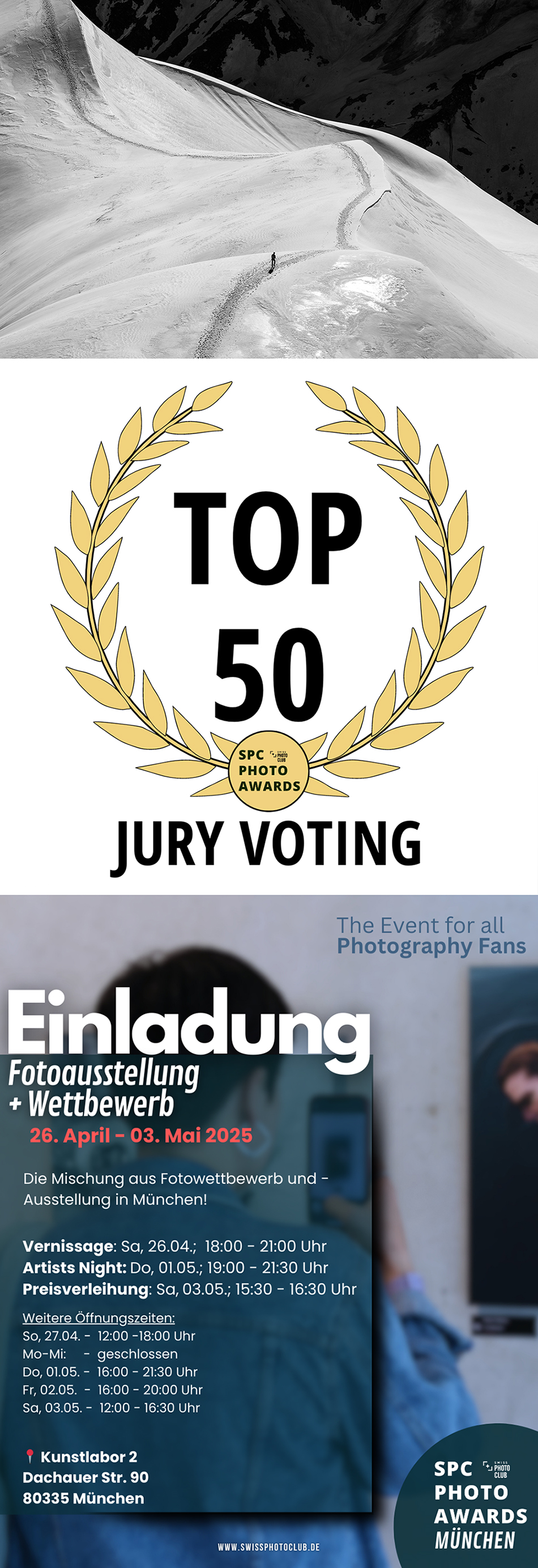Photo in Kunstlabor 2 - München, Deutschland (Top 50 Swiss Photo Club Deutschland)) 21 nov. 2024 The photo will be printed in large format by and exhibited for over a week at Gallery Photobastei in Zürich. Thanks Swiss Photo Club!