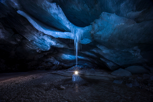 In the sheltered interior of the glacier, a single light source casts its beam across the frozen landscape. It is the headlamp of a man standing still, surrounded by ice. His light falls on an ice stalagmite on the ground, formed by meltwater dripping from above, freezing, and slowly building into a glistening point.