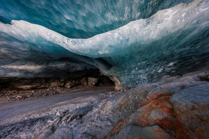The ice ceiling bows under its weight, radiant in blue and green. Below, iron-rich stones add flashes of rust-red, a striking contrast to the fragile glacier above.